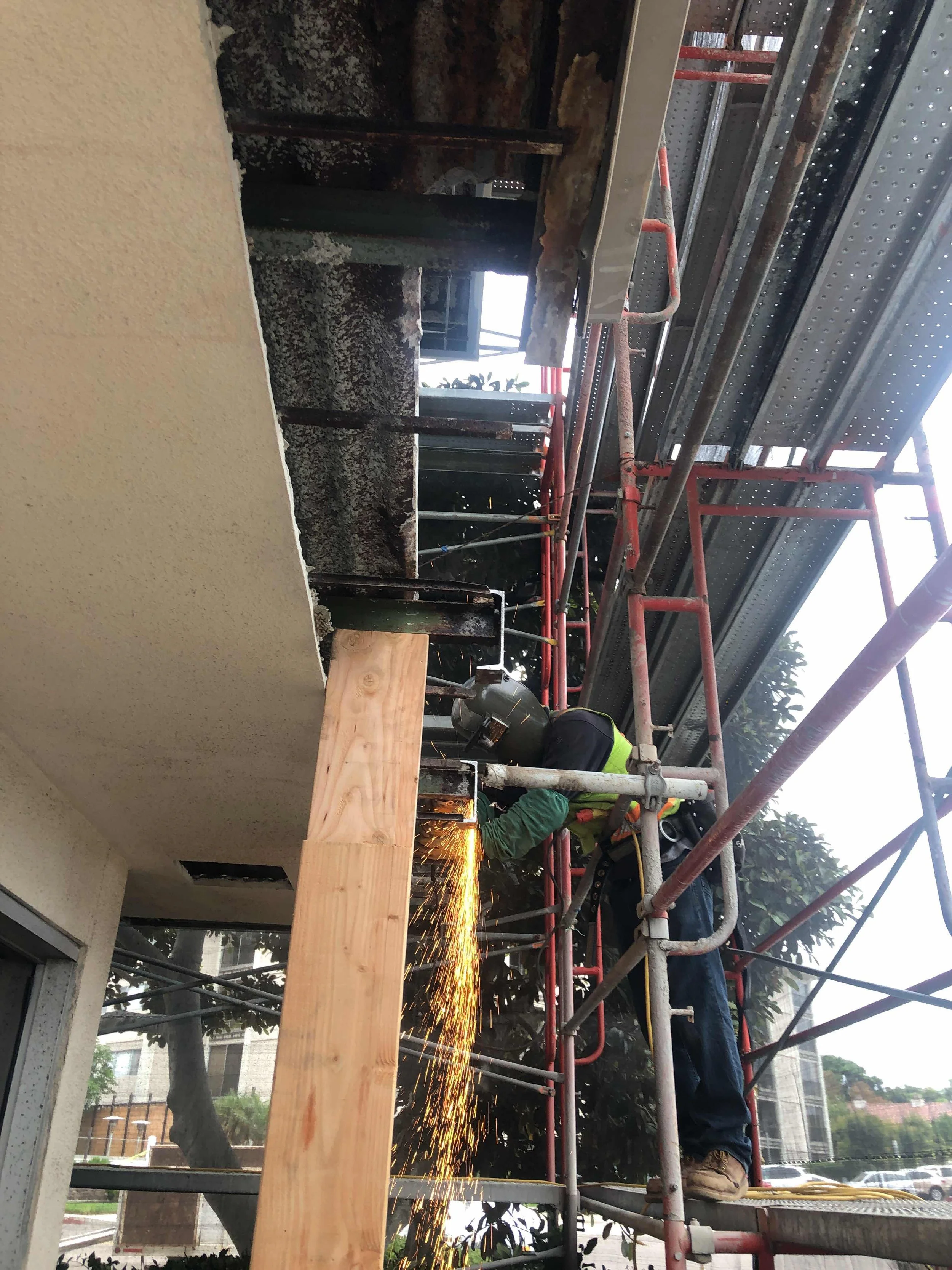 Each exterior deck was constructed with layers of metal fascia, concrete, waterproofing, and 12” stucco. Working in 20-foot sections at a time, the contractors worked to carefully remove small sections of these layers to expose the steel beneath. Throughout this process, any inconsistent prior repairs and materials changes had to be removed and renovated. This work was significant, as it was discovered that the faithful restoration of the Park Prospect Building also restored the authentic aesthetic and the function of all parts of Forester’s original design.